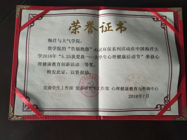 2016年7月 心理健康教育创新活动三等奖