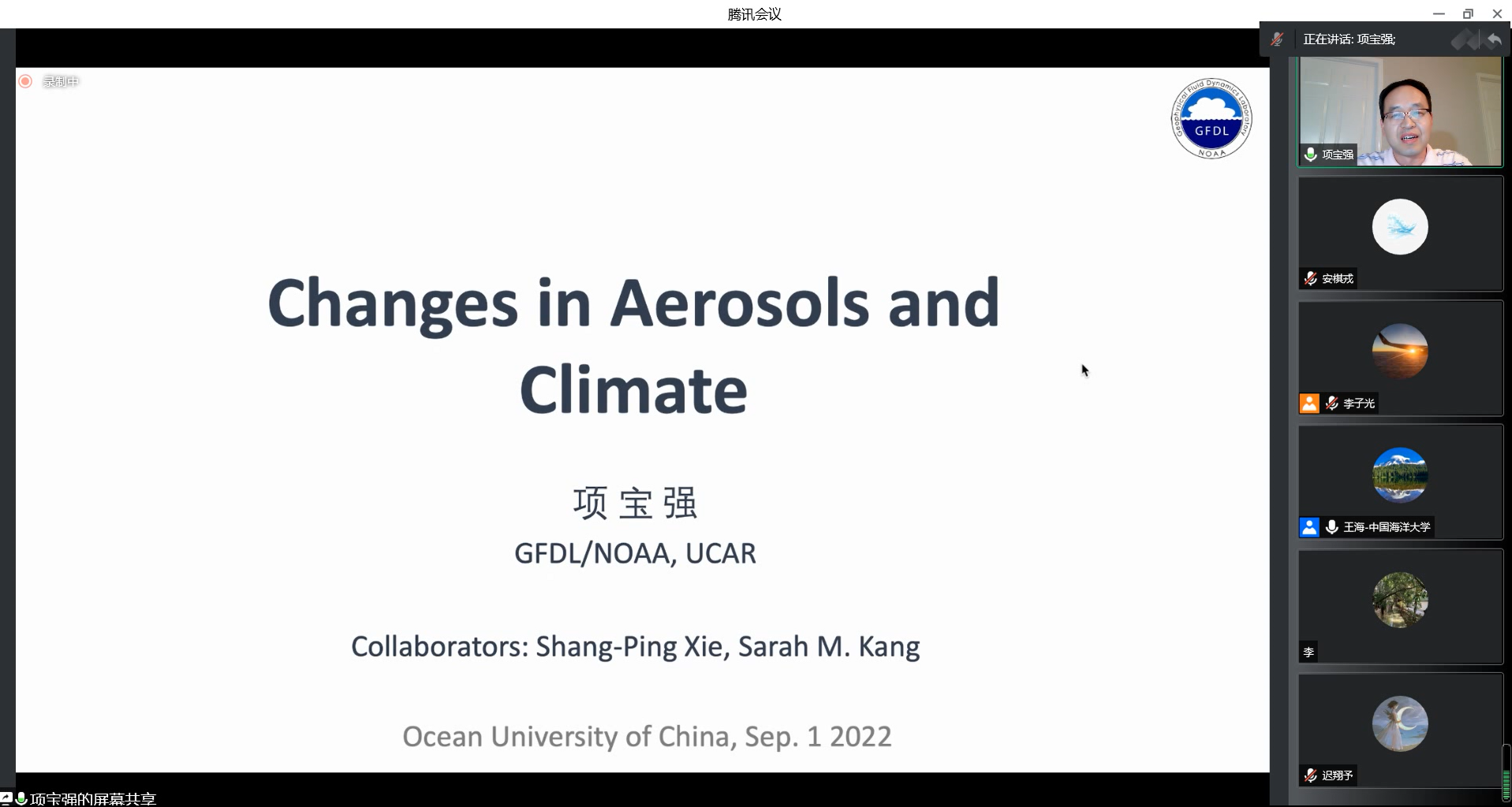 为展现我院优秀校友风采,拓宽学生科研视野,海洋与大气学院精心筹备了“同心·问海”优秀校友系列报告。9月1日,我院优秀校友美国地球物理流体动力学实验室(GFDL)研究员项宝强博士作为第三期嘉宾,应邀与学院师生们相聚云端,作了题为“气溶胶变化以及全球气候响应”的学术报告,讲座由海洋与大气学院王海副教授主持。