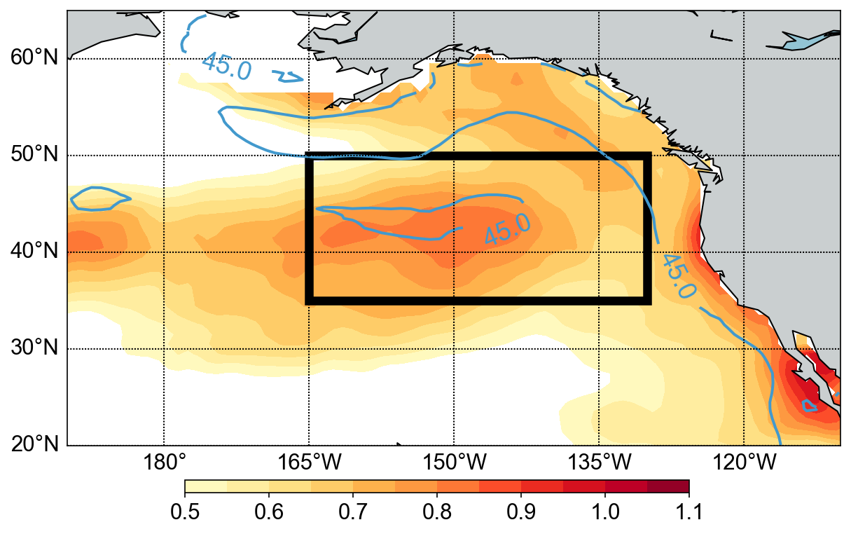 图1. 1980-2021年海表温度标准差(填色)和气候态混合层深度(蓝色等值线)。黑框表示东北太平洋暖泡发生的关键海区。