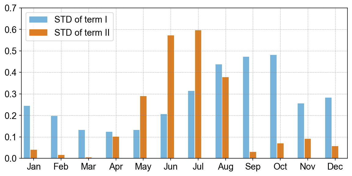 图2. 东北太平洋暖泡关键区内海气界面热通量异常项(蓝柱)和混合层深度异常项(橙柱)的逐月标准差分布。