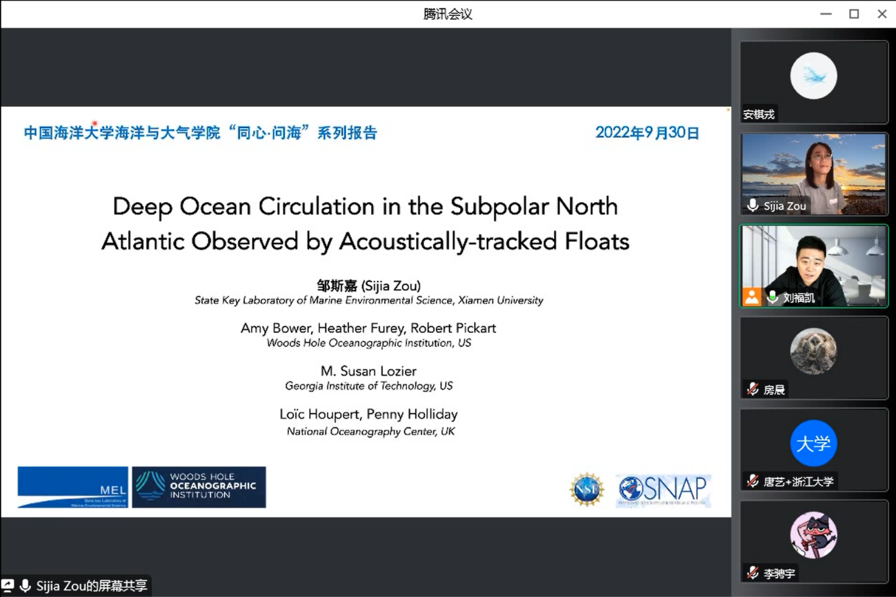 为展现我院优秀校友风采,拓宽学生科研视野,海洋与大气学院精心筹备了“同心·问海”优秀校友系列报告。9月30日,我院优秀校友厦门大学海洋与地球学院教授邹斯嘉博士作为第六期嘉宾,应邀与学院师生们相聚云端,作了题为“Deep Ocean Circulation in the Subpolar North Atlantic Observed by Acoustically-tracked Floats”(声学跟踪浮标观测到的副极地北大西洋深海环流)的学术报告,讲座由海洋与大气学院刘福凯副教授主持。