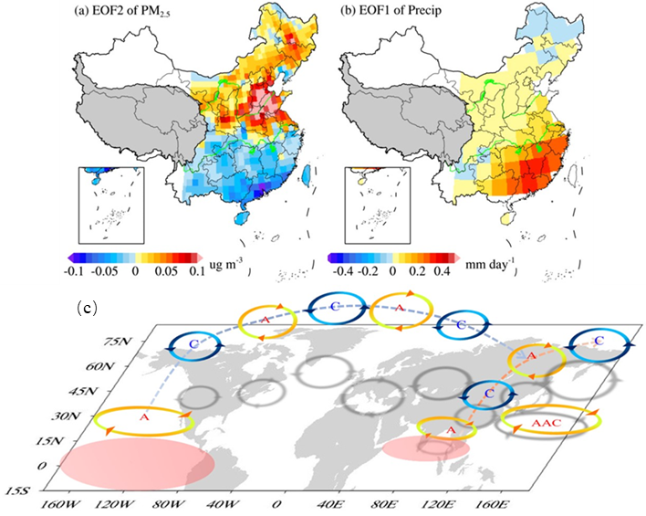 图1.中国东部冬季(a)PM2.5浓度的EOF第二模态和(b)降雨的EOF第一模态;(c)强东部型El Niño影响中国东部“南降雨—北污染”的主要途径