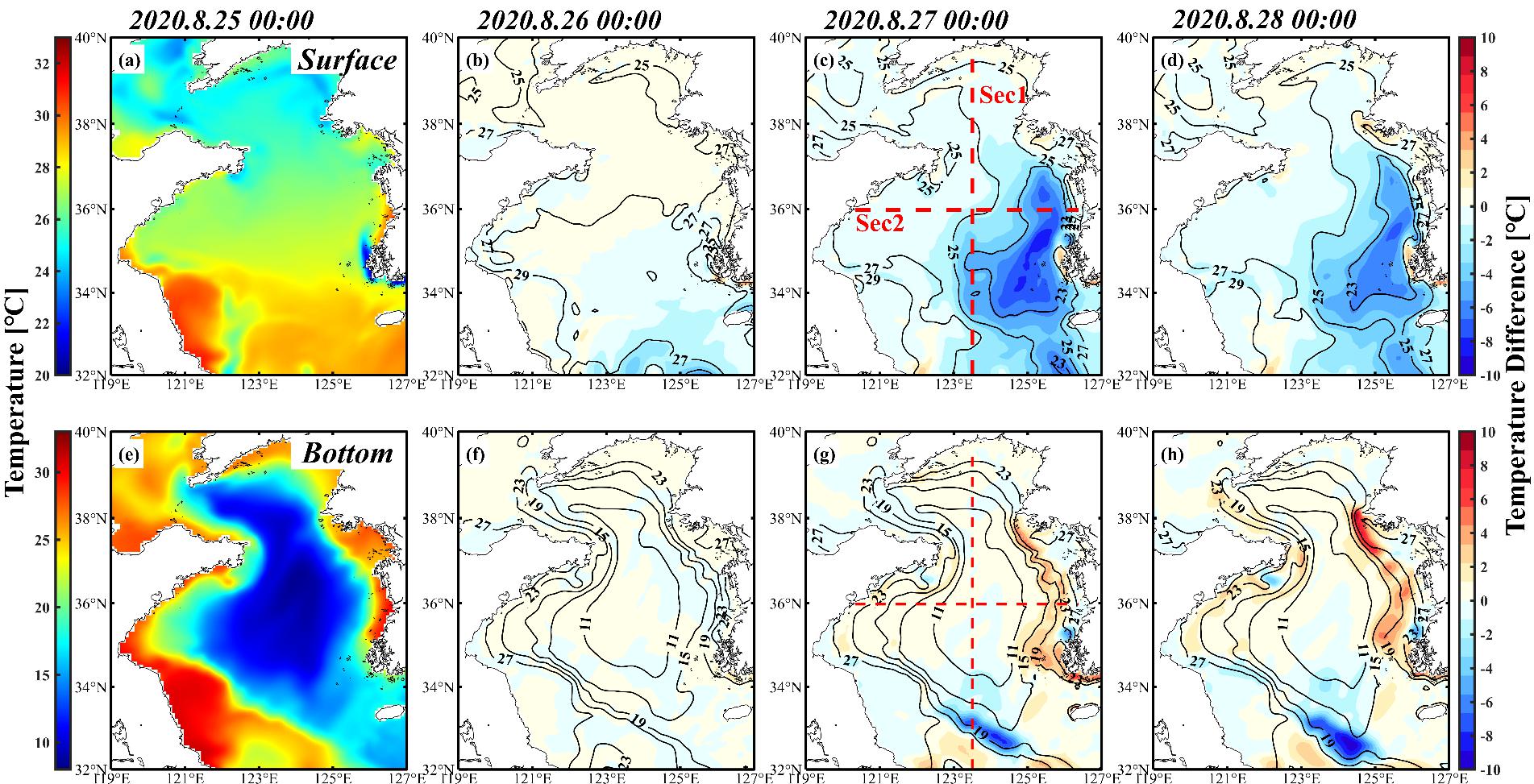 图1. (a)台风巴威过境前(8月25日)黄海表层水温(单位:℃)。(b-d)台风影响下(8月26-28日)表层水温与台风前之差(单位:℃),等值线表示实际温度。(e-h)与(a-d)类似,但为底层水温变化。