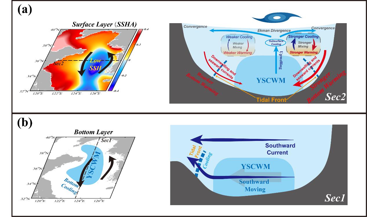 黄海作为我国边缘海具有独特的海洋生态系统,对沿岸国家的社会经济发展有着巨大贡献。近几十年来,过境黄海的台风数量呈增加趋势。在夏季,较强层结和冷水团的存在使得黄海在台风过境时具有显著的动力-生态响应。本研究选取2020年台风巴威(No. 2008)作为沿黄海东部北上台风的典型代表,系统揭示了黄海水温对此类台风过境的三维响应特征(图1):黄海表层呈现整体降温;次表层则表现为沿台风路径的降温及路径两侧的升温;在黄海底层呈现南部强降温东部显著升温的特征;与此同时,黄海冷水团整体南向移动。