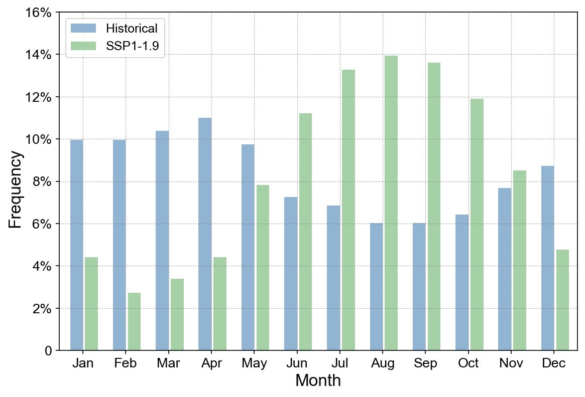 (蓝柱为历史情景,绿柱为SSP1-1.9情景)