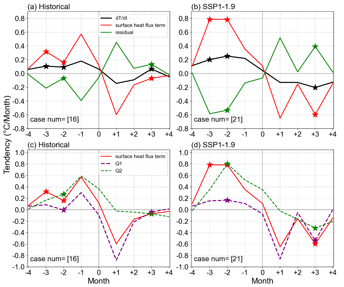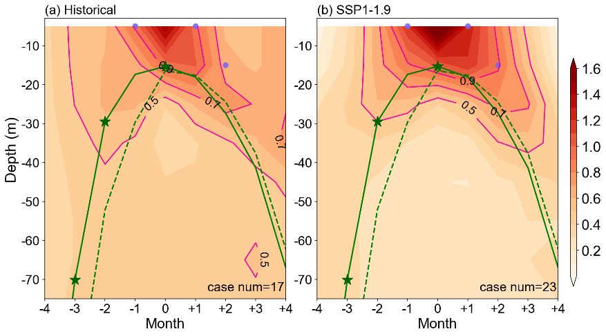 近年来,东北太平洋阿拉斯加湾附近发生了三次(2013-2014年、2015年和2019-2020年)备受瞩目的持续性暖斑事件,对气候、生态系统和社会经济产生了重大影响,已成为当前学界研究的热点话题。为揭示东北太平洋暖斑在未来的可能变化规律,本研究利用第六次国际耦合模式比较计划(CMIP6)的多模式数据,研究了共享社会经济路径(SSP)1-1.9和1-2.6两个低增暖情景下,东北太平洋持续性暖斑在季节性、频率、强度、持续时间和垂直结构等方面的变化。结果表明,暖斑的发生频率在未来无明显变化;但增暖前暖斑主要发生于北半球冬、春季,而增暖后的本世纪下半叶暖斑集中于夏季(图1)。以在夏季达到峰值的暖斑为例,在SSP1-1.9情景下,其最大强度增加6.7%,而持续时间减少31.0%;在SSP1-2.6情景下,其最大强度增加10.0%,而持续时间减少20.4%。从垂直结构上看,暖斑信号主要集中于混合层内,而混合层深度随着全球变暖日益变浅(图2)。进一步分析表明,变浅的混合层通过调制海气界面热通量异常成为暖斑未来增强的主导因子,而暖斑峰值后海洋失热的增加则成为其迅速衰亡、持续时间缩短的原因(图3)。另一方面,在与厄尔尼诺-南方涛动的联系上,未来东北太平洋暖斑在夏季达到峰值后,由于热带太平洋西南风异常加强了局地的海气耦合,冬季极端El Niño事件的发生可能更为频繁。该研究成果对理解和认识全球变暖背景下中纬度海气相互作用及热带外-热带相互作用有重要意义。