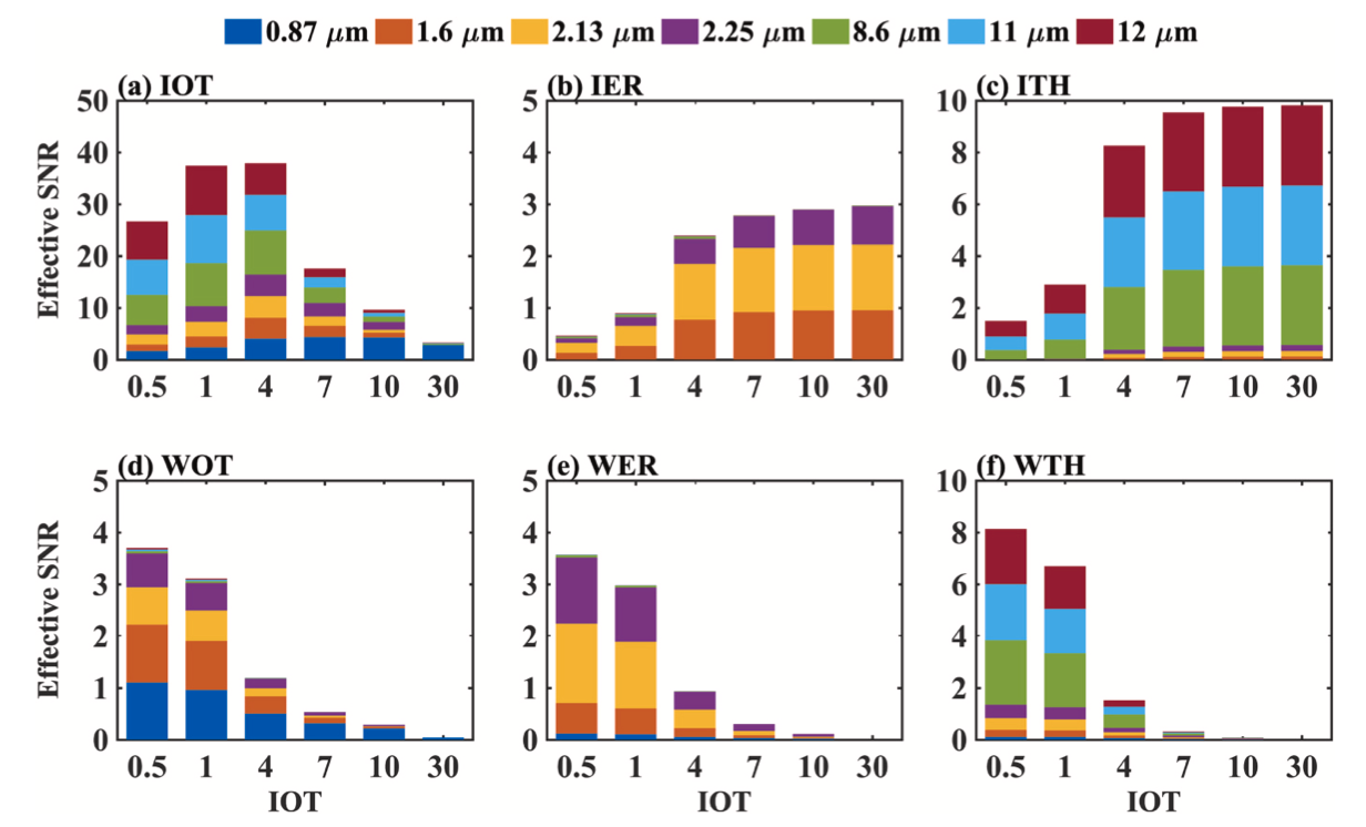 图2. 短波红外和长波红外观测对不同重叠云特性的敏感性分析。