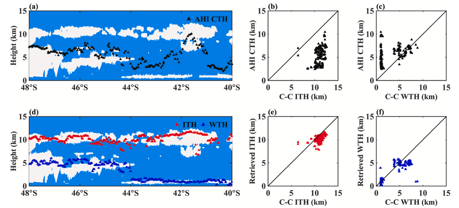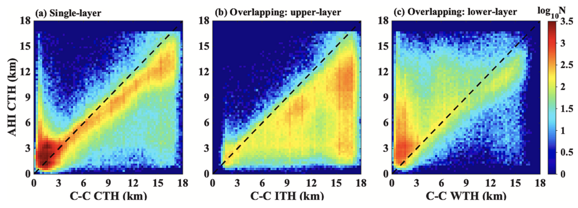 图1. (a)单层云和(b、c)重叠云情况下AHI云顶高度产品与CPR-CALIOP联合云顶高度产品的对比评估。
