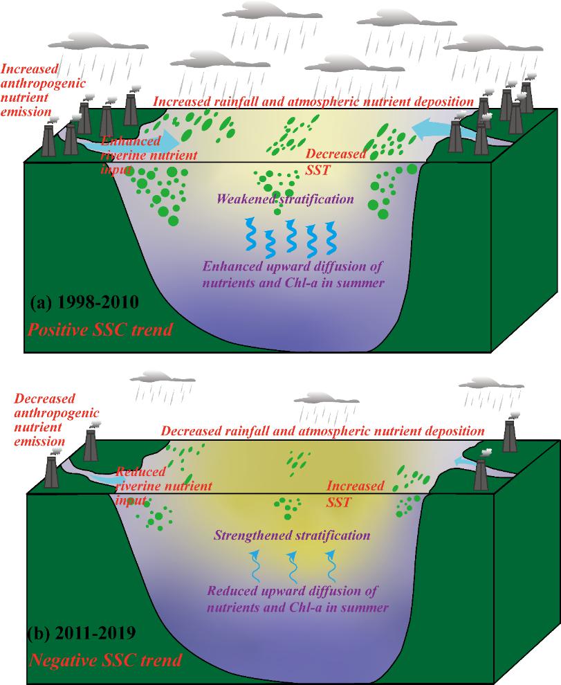 图.2过去22年间渤黄海表层叶绿素浓度年代尺度趋势变化的影响机制示意图。