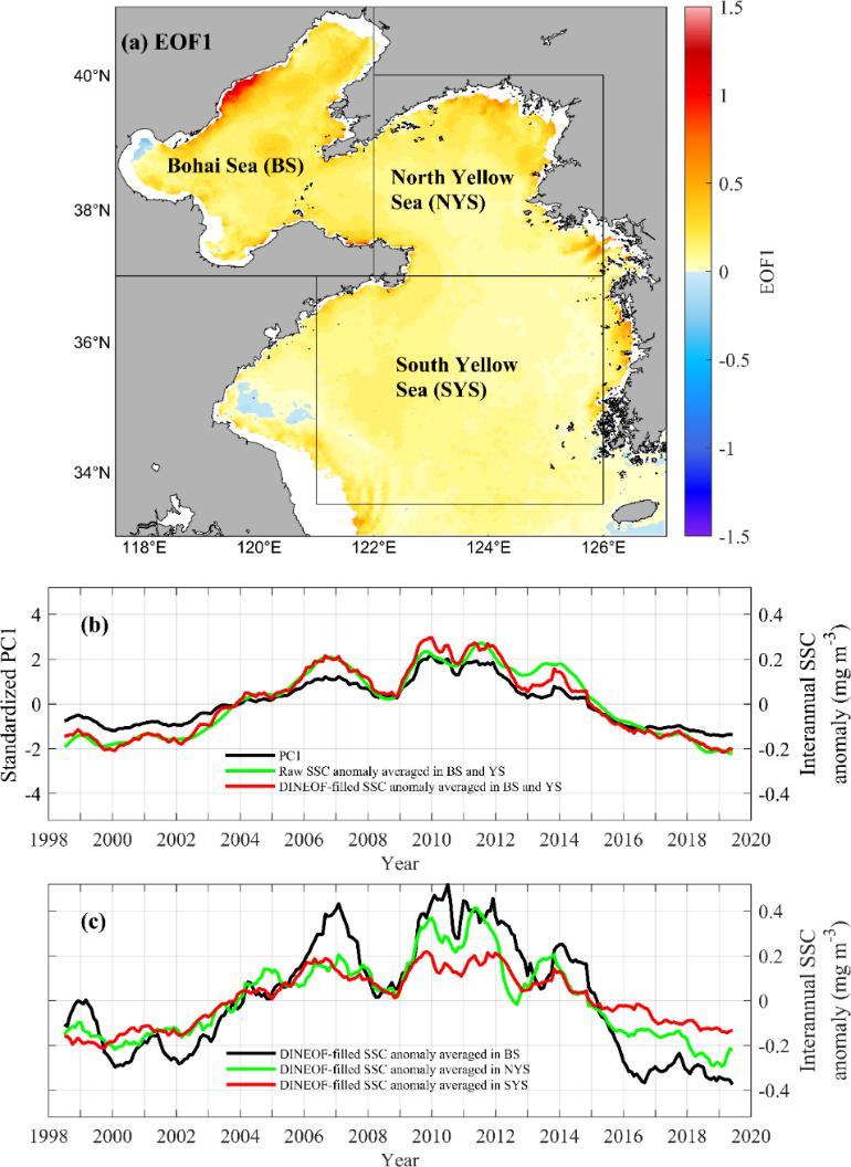 图1. (a)渤海和黄海表层叶绿素浓度年际异常的经验正交函数第一模态。(b)经验正交函数第一模态的标准化时间系数与区域平均的表层叶绿素浓度年际异常(单位:mg m‒3)时间序列。(c)渤海、北黄海和南黄海区域平均的表层叶绿素浓度年际异常(单位:mg m‒3)时间序列。