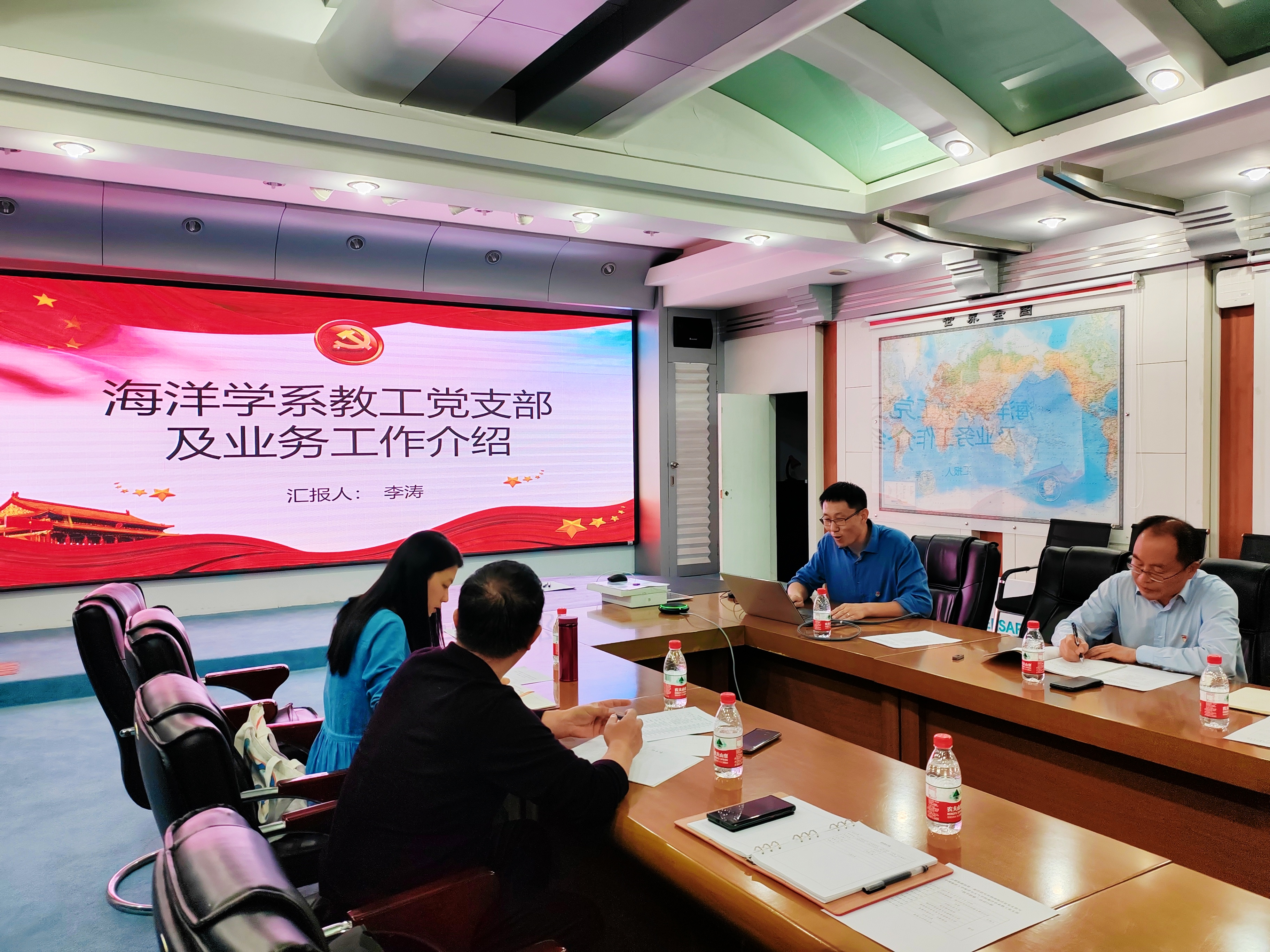 李涛介绍了海洋学系教工党支部及业务工作的基本情况,对党支部的组织架构、历史沿革以及海洋学系的教学科研平台、研究领域、本科生和研究生教学基本情况作出了简要概述。戴德君介绍了海洋环境与数值模拟研究室的人员组成、学科方向和支部建设等情况,重点阐述了研究室海洋动力学、海洋动力系统数值模式体系、海洋环境安全保障平台三个学科方向及其丰富的研究成果。
