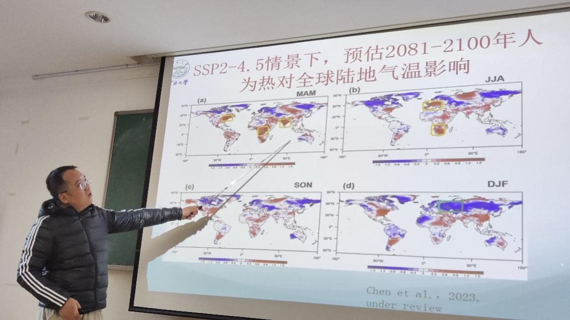 陈兵副教授首先介绍了人为热释放的基本概念,阐述了其研究的重要性。人为热释放是人类活动消耗能源如化石燃料、核能等产生、排入到地球气候系统的能量,其导致的加热效应能够影响近地层的能量平衡,对气候造成影响。随后陈兵副教授针对人为热释放的全球分布估算和模式参数化、基于CESM的研究结果和未来情景下的全球气候效应三方面作了详细的报告。以往的研究局限于人为热释放的区域气候影响。陈兵副教授团队发现,人为热释放能对全球气候产生影响。人为热释放能够通过低层对流层稳定度对低云产生作用,进而影响气候。此外,陈兵副教授还指出这种增温影响能够很好弥补目前全球模式对区域温度的低估。现有的气候模式对人为热释放的升温效应考虑不足,人为热释放对模拟和评估人类活动对全球变暖具有重要科学意义。该项研究为进一步研究北极增暖和极端天气机理提供了重要基础。
