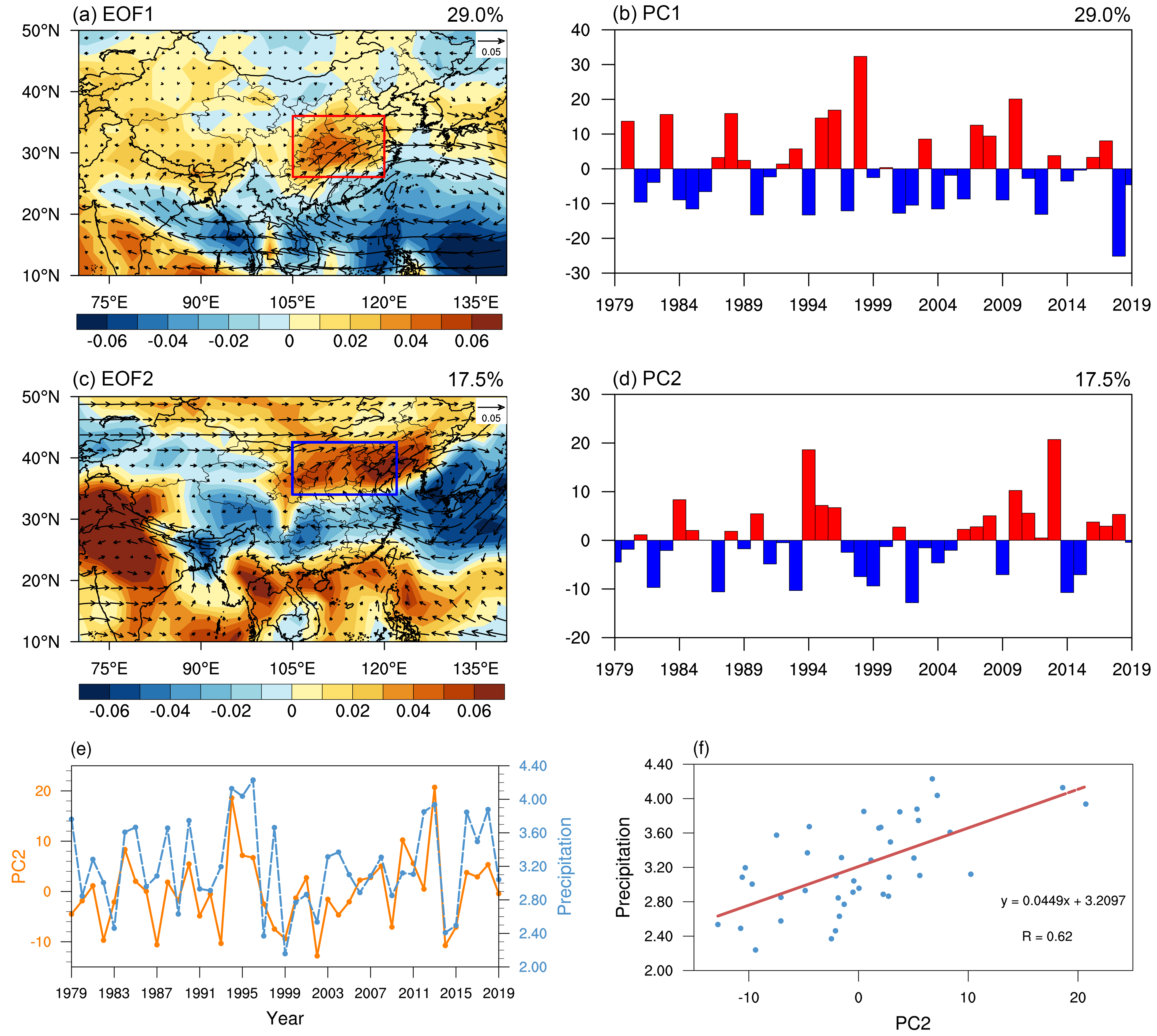 1. 19792019年夏季降水(阴影)和整层水汽通量(矢量)的MV-EOF主导模态(ac)和相应的时间序列(bd)。(a)和(c)中的红色和蓝色矩形分别代表长江流域和华北地区。19792019PC2和夏季降水的时间序列(e)及散点分布(f)。