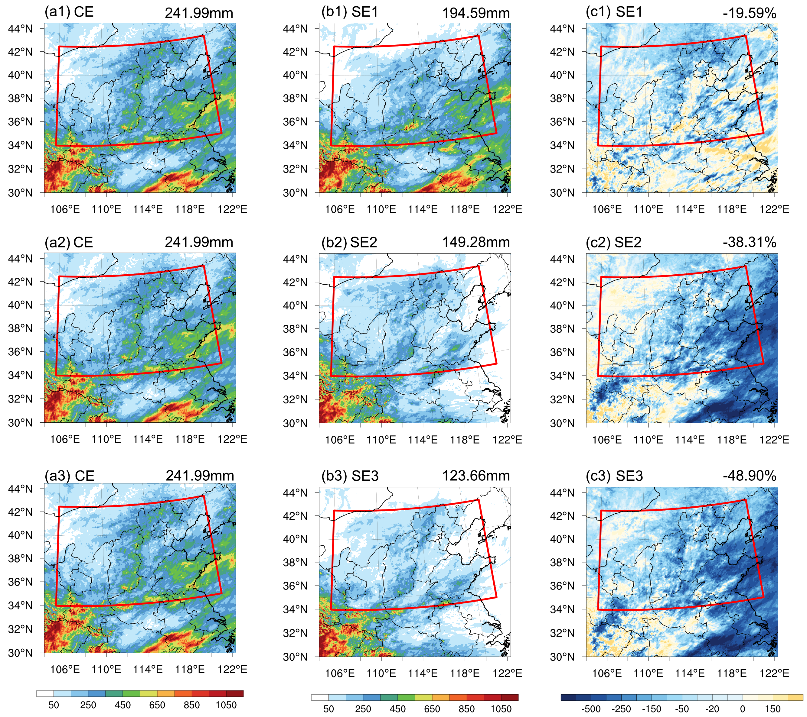 2. 左列为正常模拟得到的降水;中间列为不同敏感性试验得到的降水,其中SE1为西风水汽输送减半、SE2为东亚季风水汽输送减半、SE3为西风和东亚季风水汽输送同时减半;右列为正常模拟与敏感性试验之间的降水差值。