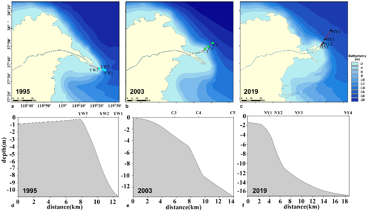 图1. 1995、2003和2019年的黄河口观测断面地形图。1995、2003和2019年的河口向海凸出距离分别约为27 km(a)、17 km(b)和23 km(c),水下三角洲前缘的平均坡度分别约为0.0026(d)、0.001(e)和0.002(f)。