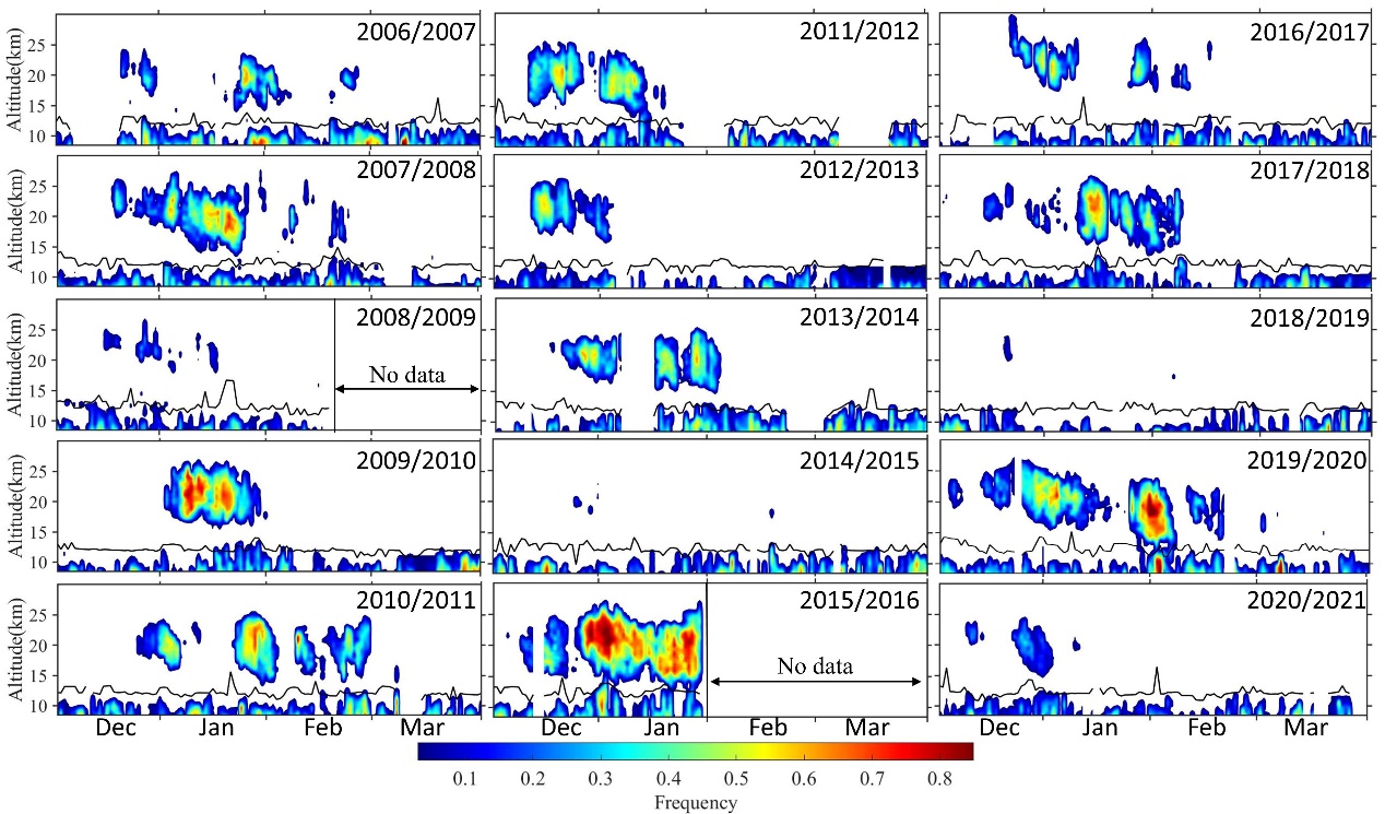 研究发现,北极PSCs最早出现在12月,受到平流层温度和极涡的影响,PSCs每年会持续到不同月份。通常情况下,PSCs存在于15–25 km高度上,但PSCs的高度会随着冬季时间的持续呈下降趋势(图1)