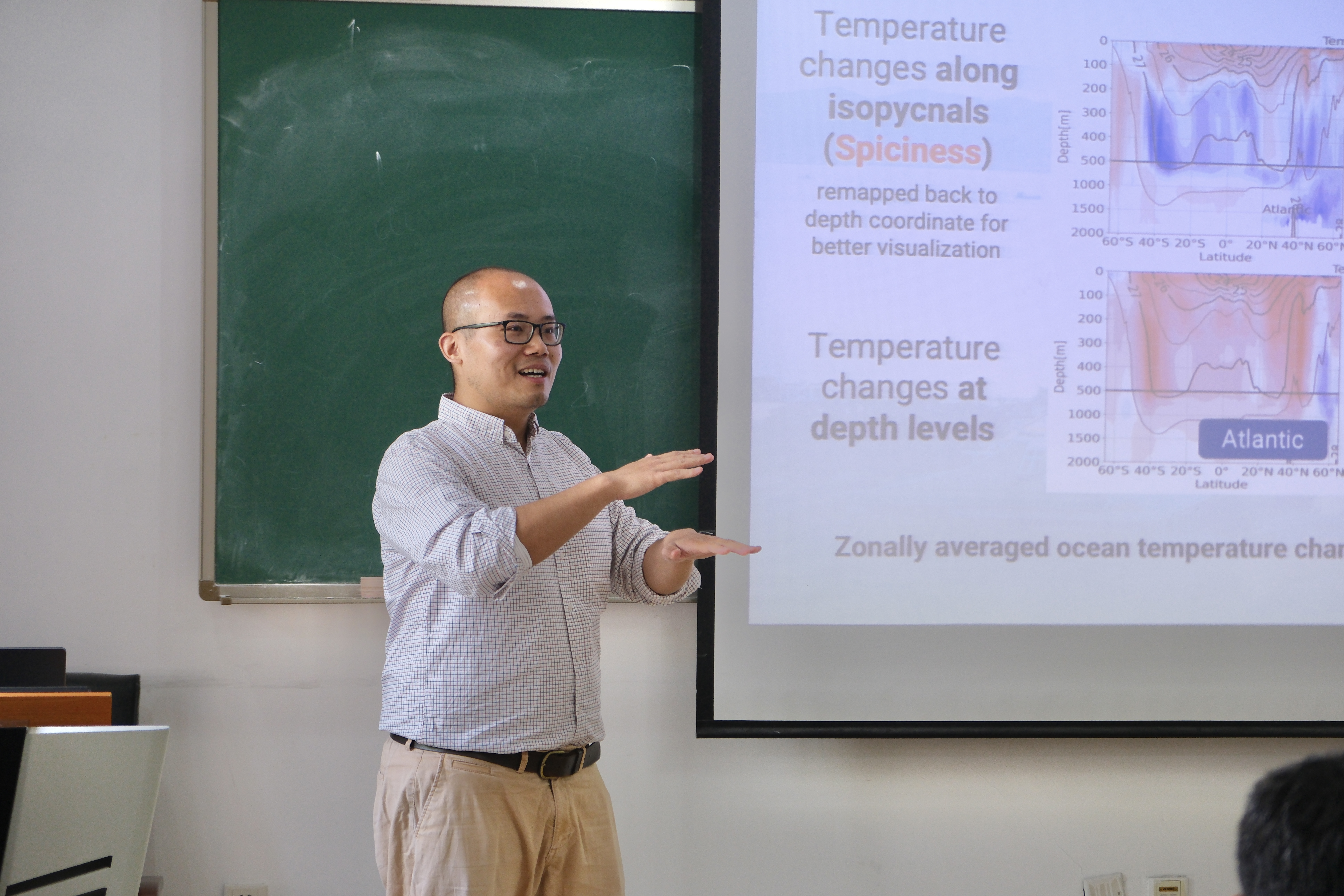 在互动交流环节,参与讲座的师生就涩度概念的理解、深度与密度坐标转换计算、等密面起伏等问题展开了踊跃提问并与吕柯伟教授进行深入的交流探讨。本次学术报告促进了我院师生对海洋温、盐特性变化最新科研进展的认识和了解,开阔了大家的视野、促进了学术交流。
