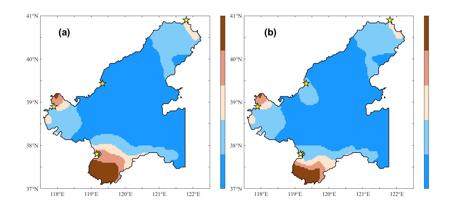 图3.(a) 最优组与原始实验组的渤海表层总氮浓度值之差;(b) 最优方案下渤海表层各类水质分布。