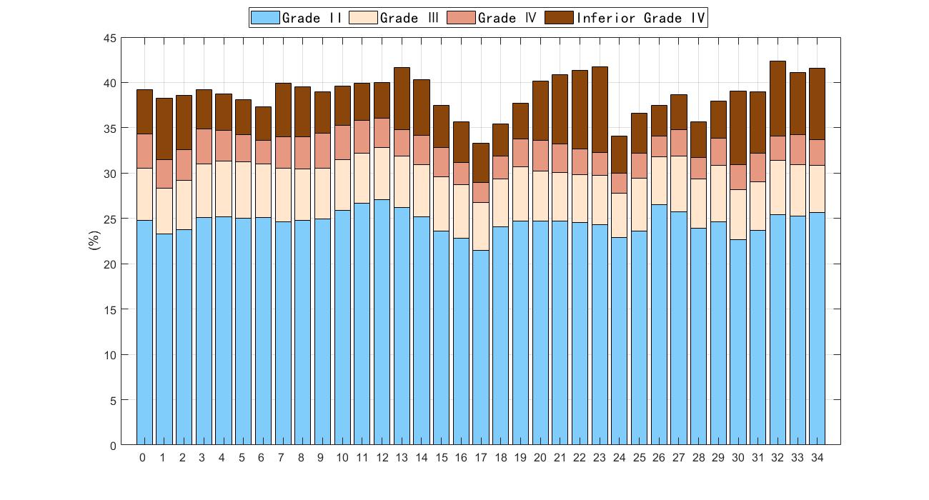 图2.各分配方案下四种非一类水质面积占比(各类水质面积占总海域面积的比例)。