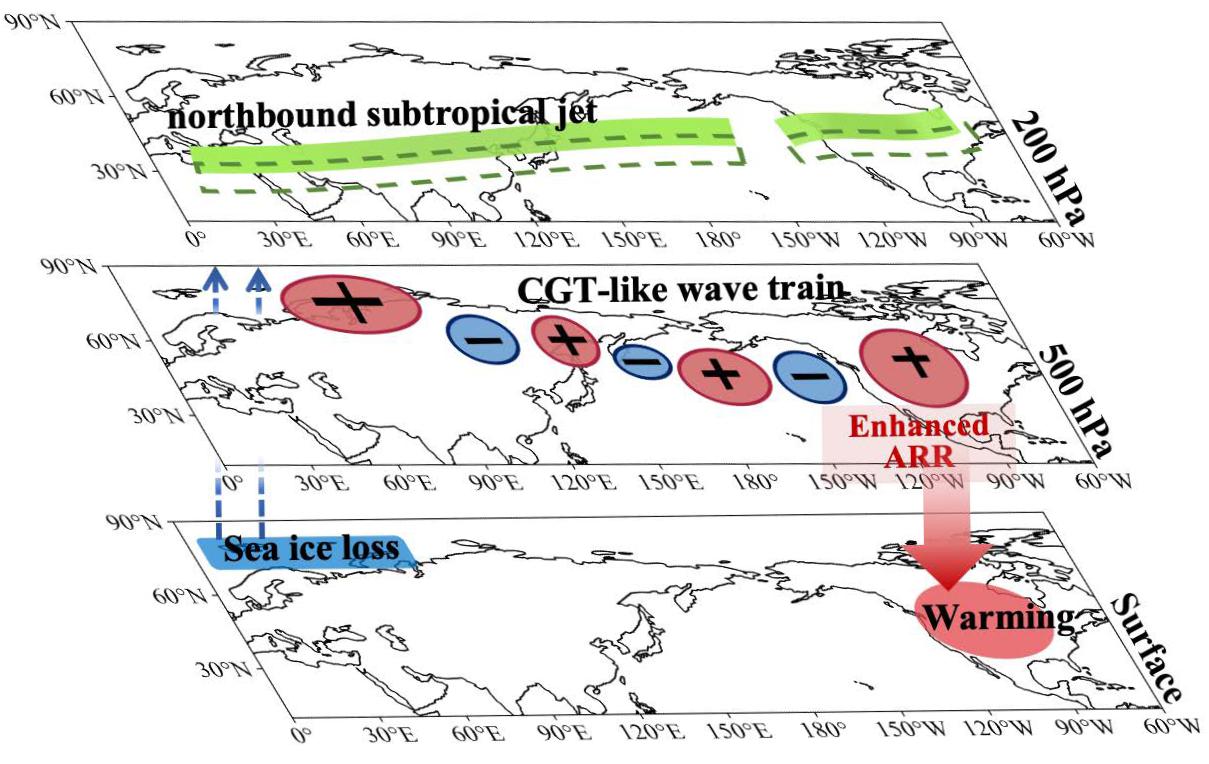 图1. 巴伦支海海冰(蓝色条带)通过Rossby波和急流导致北美地区极端热浪的机制示意图。200 hPa的绿色虚线框表示气候态的急流,绿色条带表示海冰融化时向北移动的急流。蓝色箭头表明巴伦支海海冰将能量传递给遥相关波列(500 hPa的蓝色和红色圆圈)。