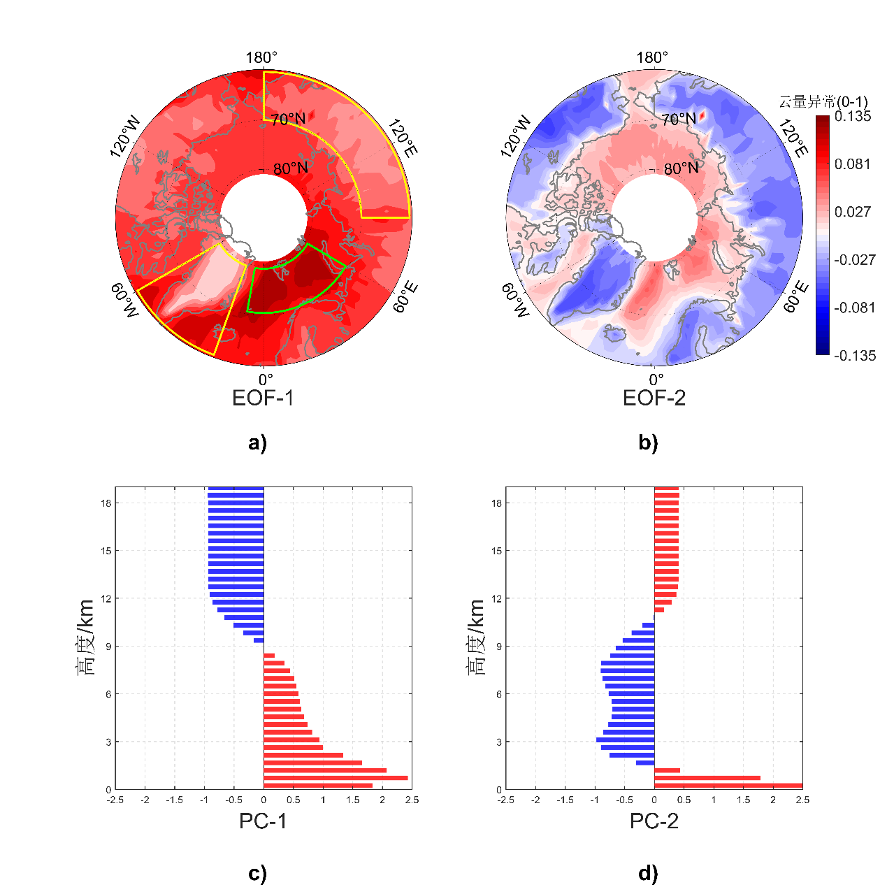 图1. 2007—2020年气候平均的北极地区云量三维结构的EOF分解。a)第一模态特征向量场EOF1;b)第二模态特征向量场EOF2;c)EOF1主成分PC1;d)EOF2主成分PC2。