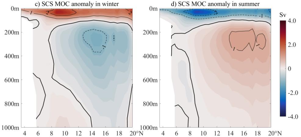 图1. 南海中层经向翻转环流(IMOC)的季节异常(Sv):(左图)冬季,(右图)夏季。黑色粗实线表示流函数数值为0。