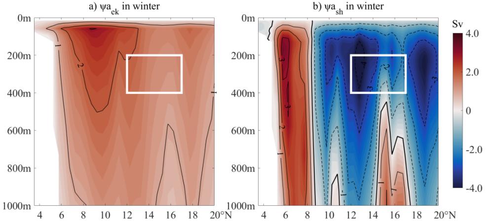 图2. 南海中层经向翻转环流(IMOC)冬季季节异常的动力分解(Sv):(左图)Ekman分量,(右图)垂向剪切分量。黑色粗实线表示流函数数值为0。