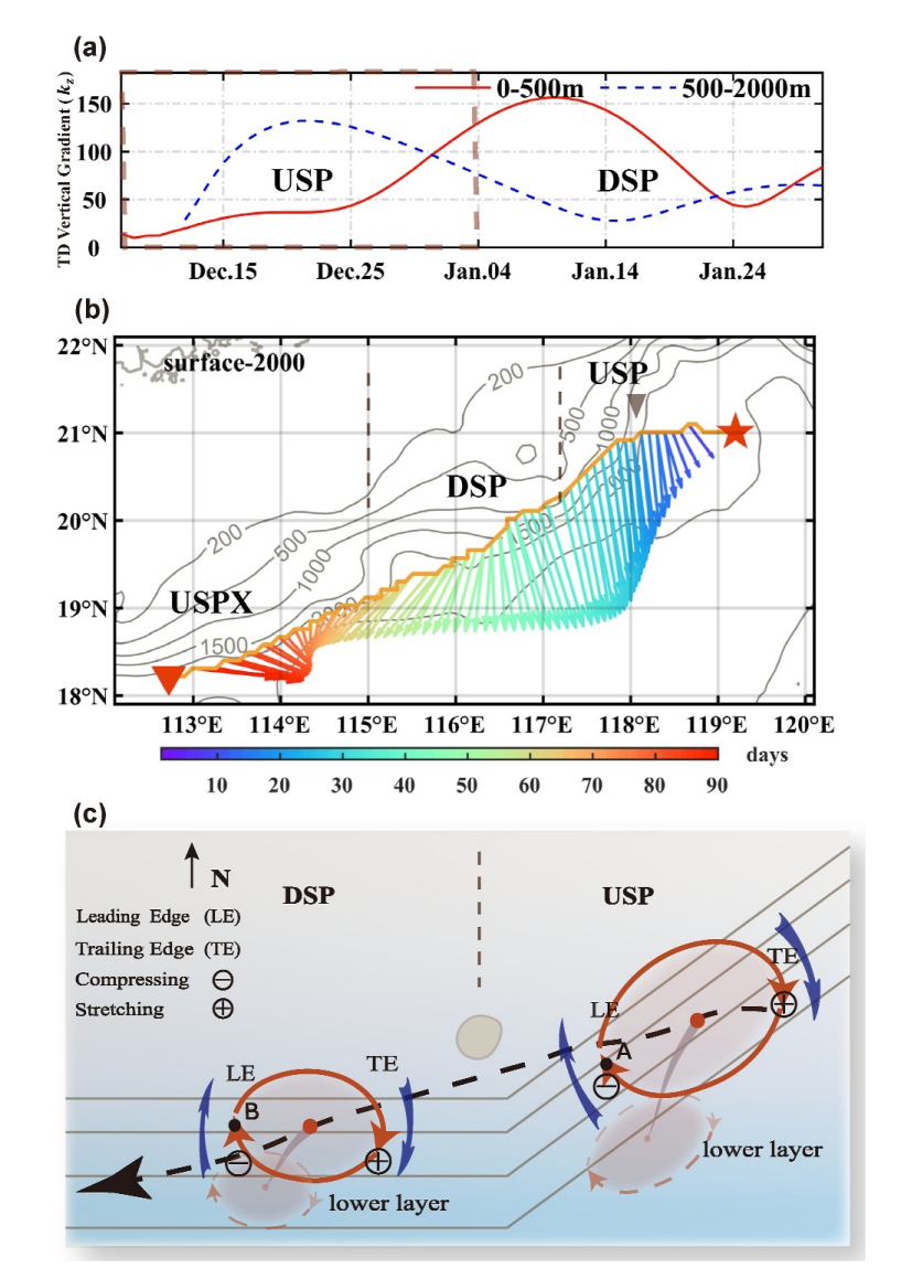 已有研究表明,在斜坡地形的影响下南海中尺度涡普遍具有垂向倾斜结构,对物质、能量的水平和垂向输运具有重要影响。然而,涡旋在传播过程中其垂直倾斜特性是否会随地形变化而调整,仍未得到充分的认识。本研究利用高分辨率数值模拟探究了南海北部陆坡地形对中尺度涡垂向倾斜结构变化的影响。对斜坡区域和海盆区域涡旋的合成结果表明,斜坡地形附近的涡旋比深海海盆区域涡旋在垂向上呈现出更加明显的西南向倾斜,且在东沙群岛附近的涡旋倾斜幅度最大。从一个典型的黑潮脱落暖涡来看,涡旋垂向倾斜的方向和幅度均依赖地形坡度的变化。首先,由于位涡守恒涡旋下层基本沿等深线移动,而上层大致沿西南方向移动,这种上、下层移动方向的差异导致了垂向倾斜方向在经过东沙群岛前后的明显不同;其次,涡旋下层对地形变化的响应比上层更快且更为显著,下层倾斜幅度在爬坡阶段约为上层的2.5倍,而在下坡阶段仅为上层的50%,这种上、下层响应的不一致性则造成了涡旋垂向倾斜幅度的显著变化(图1)。本研究有助于增强我们对海洋涡旋三维结构时空演变和地形关系的认识。