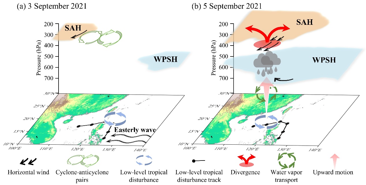 图2.热带扰动引发南海北部强降水机制图。(a)强降水发生前,(b)强降水发生时。