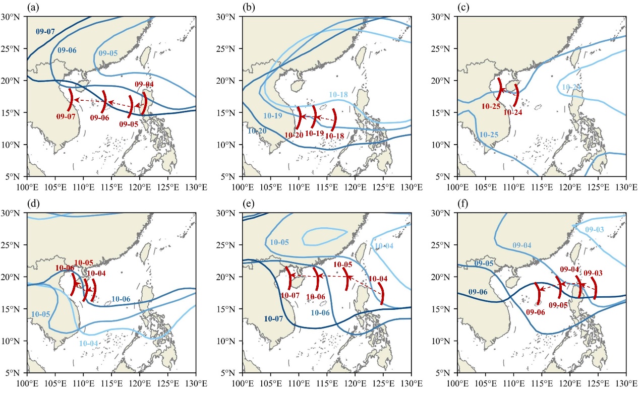 图1. 500 hPa 588位势什米等值线(蓝色,随时间颜色加深)和850 hPa热带扰动槽线(红色,经向速度零线)分布。(a)2013年9月,(b)2014年10月,(c)2014年10月,(d)2017年10月,(e)2019年10月,(f)2021年9月。