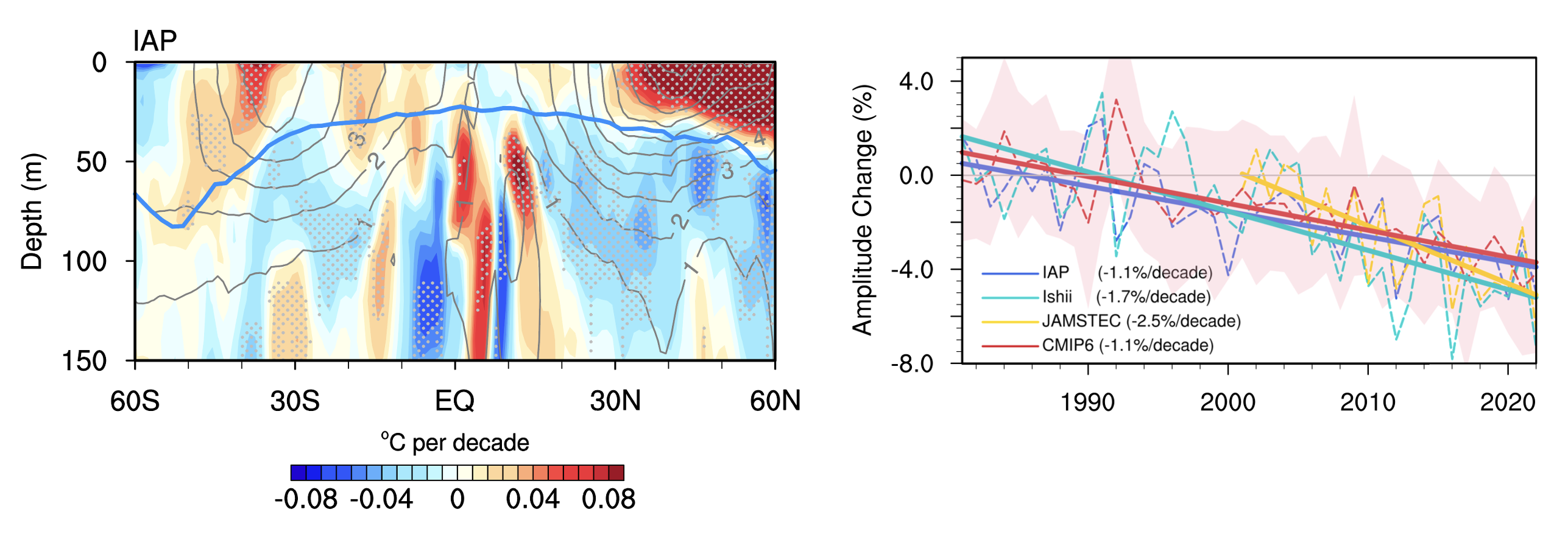 图1. (左)1982-2022年纬向平均海温年循环振幅的变化趋势;(右)不同数据中次表层海温年循环振幅的变化。