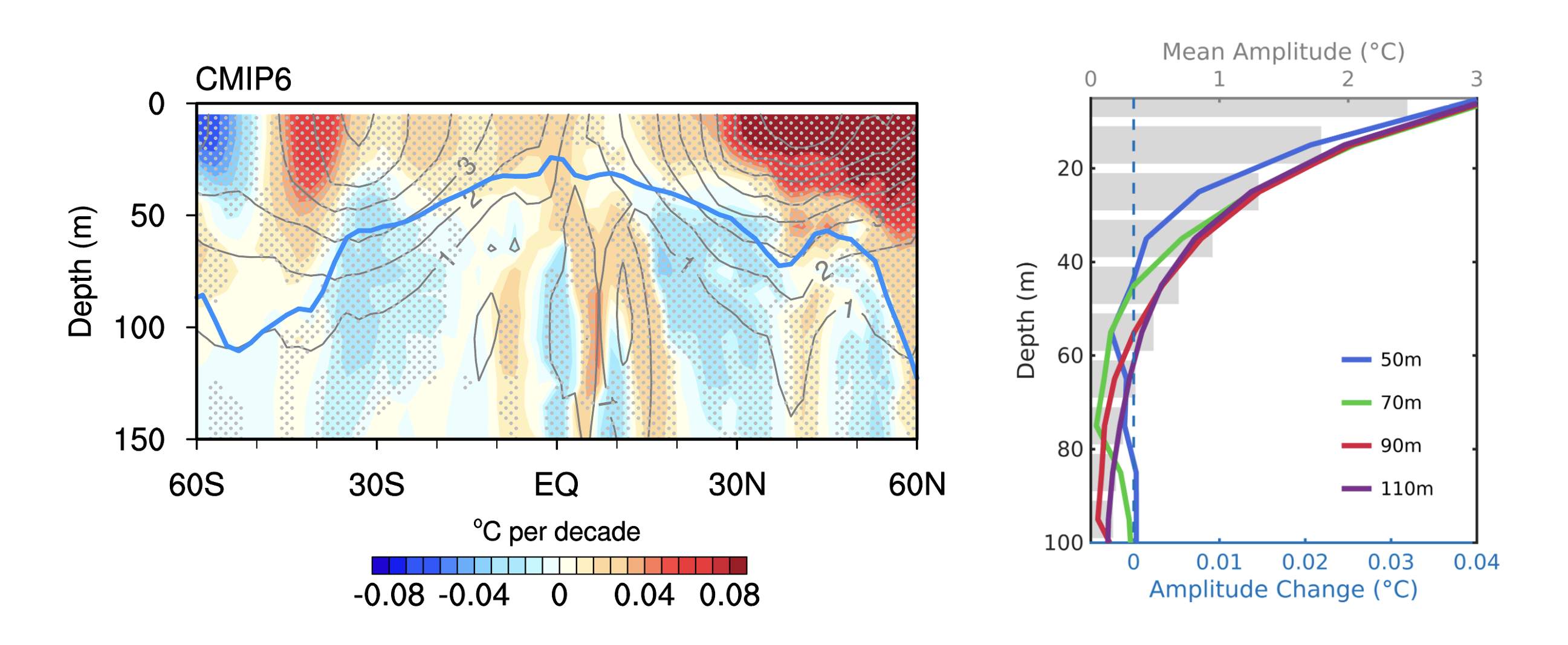 季节循环是上层海温变化最显著的信号,对气候系统和生态环境具有重要影响。团队的前期研究(Liu et al., 2024 NC)发现,过去四十年全球海表温度的年循环振幅增强了约4%,特别是在临近我国的北太平洋,增幅甚至超过了10%,这对海洋生态系统和环境产生了显著影响。然而,关于年循环变化的研究主要集中在海洋表层,次表层海温的年循环是否也发生了变化并不清楚。