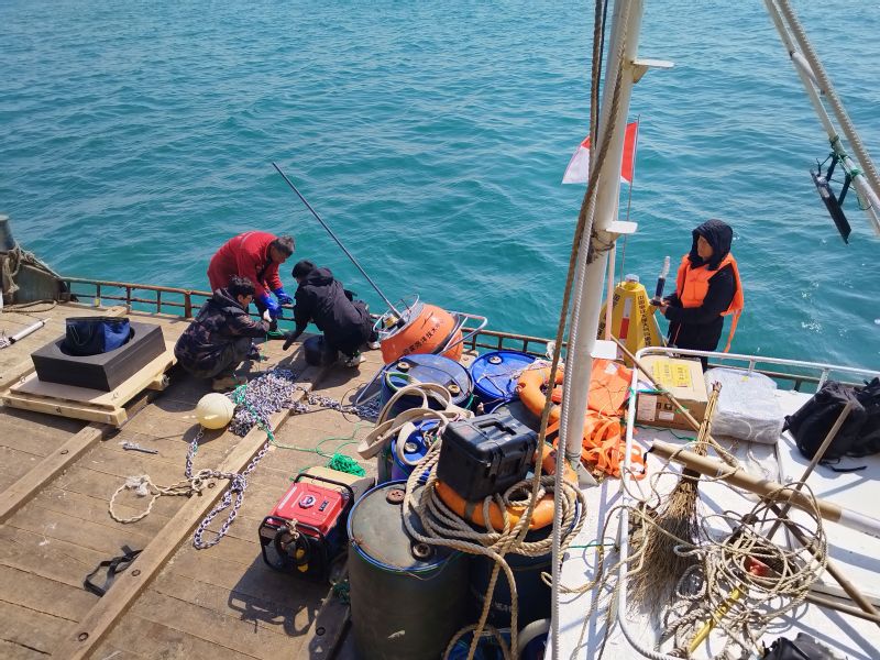 自2024年11月19日“海上实验室”启动仪式举行后,海洋与大气学院一直在积极筹划各类观测设备的购置、测试与布放工作。在各项测试工作完成、布放条件成熟后,学院协调万泽丰集团于3月20日开始海上布放工作。布放持续两天,最终安装布放的三套海洋水文气象观测系统,可用于测量海水温度剖面、盐度、水深、叶绿素、溶解氧、pH、浊度、营养盐、二氧化碳、波浪、三维超声风速、空气温湿度等及水下视频,实现了“海上实验室”的综合性立体观测。