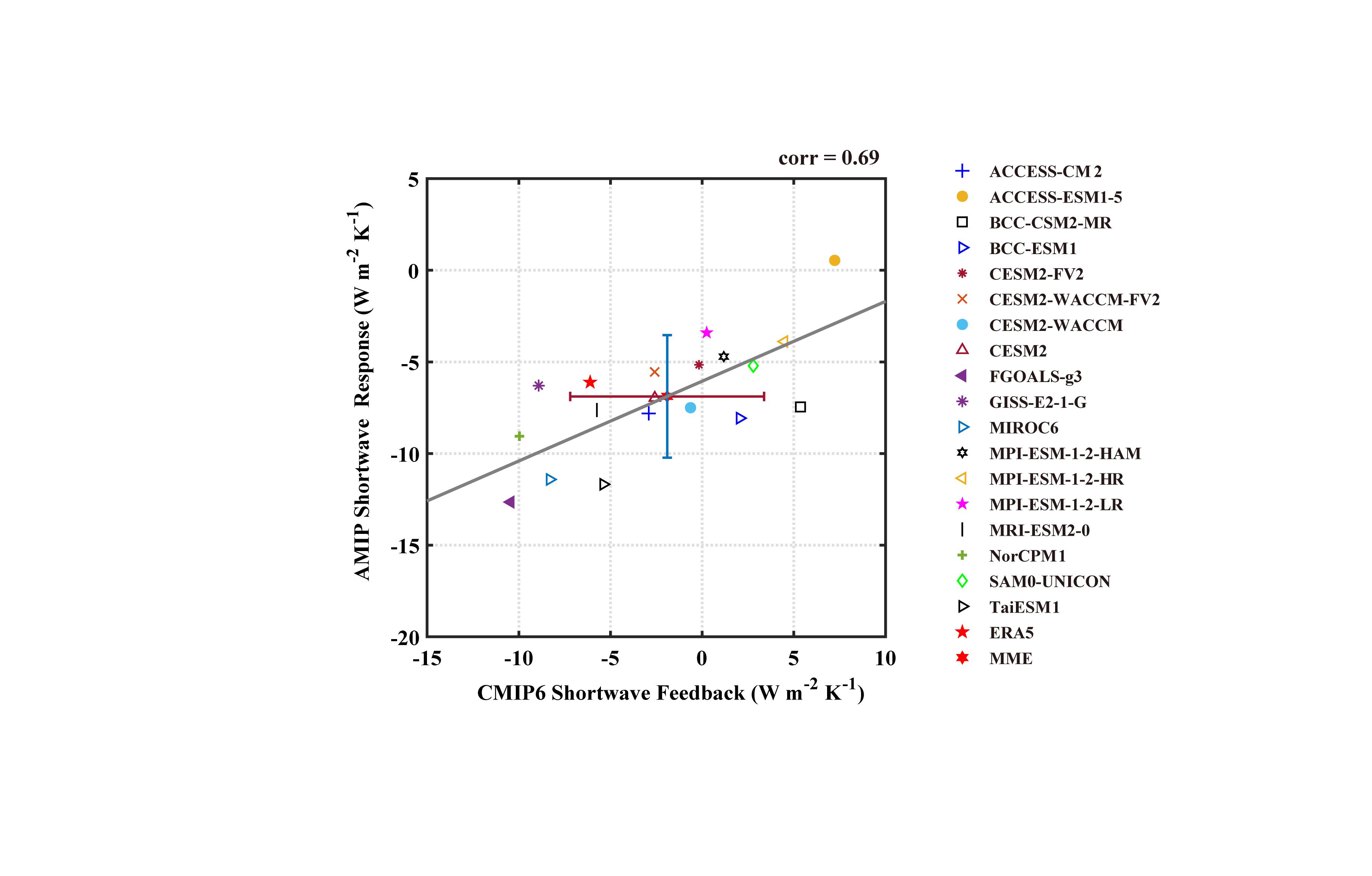 图2. CMIP6和AMIP中Niño3.4区短波辐射响应散点图。红色水平误差棒表示CMIP6模式间标准差,蓝色垂直误差棒则代表AMIP模式间标准差。