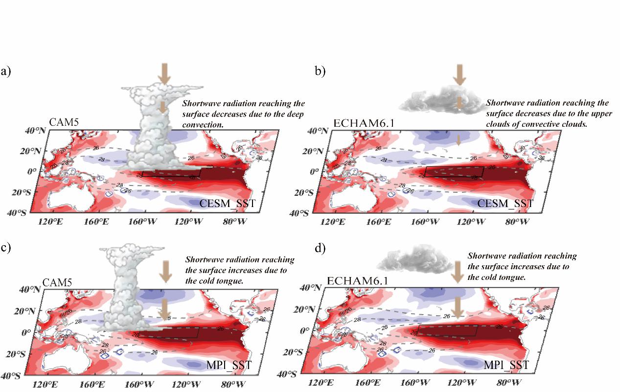 基于前人的研究基础,本研究重点探讨了厄尔尼诺强度、气候态海温以及大气模式差异对ENSO云辐射反馈的影响。试验结果表明,在气候态海温较高的背景下,对流活动增强,Niño3.4区产生负的短波辐射响应(图1a,b);反之,在气候态海温较低且冷舌较强时,短波辐射响应则呈正值(图1c,d)。此外,ECHAM6.1未能准确模拟出对流云对厄尔尼诺的响应特征,尤其在中云的模拟上存在较大偏差(图1b,d),致使其模拟的短波辐射响应数值高于CAM5的结果。