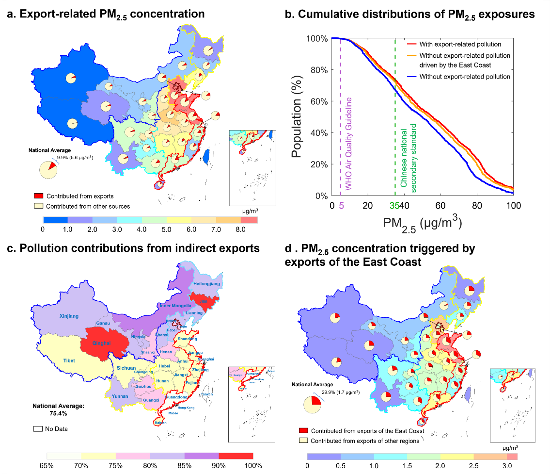 图1. 2017年中国由出口造成的PM2.5污染。(a) 中国各省由出口驱动的人口加权PM2.5浓度及其在各省总浓度中的占比;(b) 中国PM2.5浓度与人口暴露比;(c) 间接出口对中国各省出口污染的贡献占比;(d) 中国各省由东部沿海出口需求驱动的人口加权PM2.5浓度及其在各省出口污染中的占比。