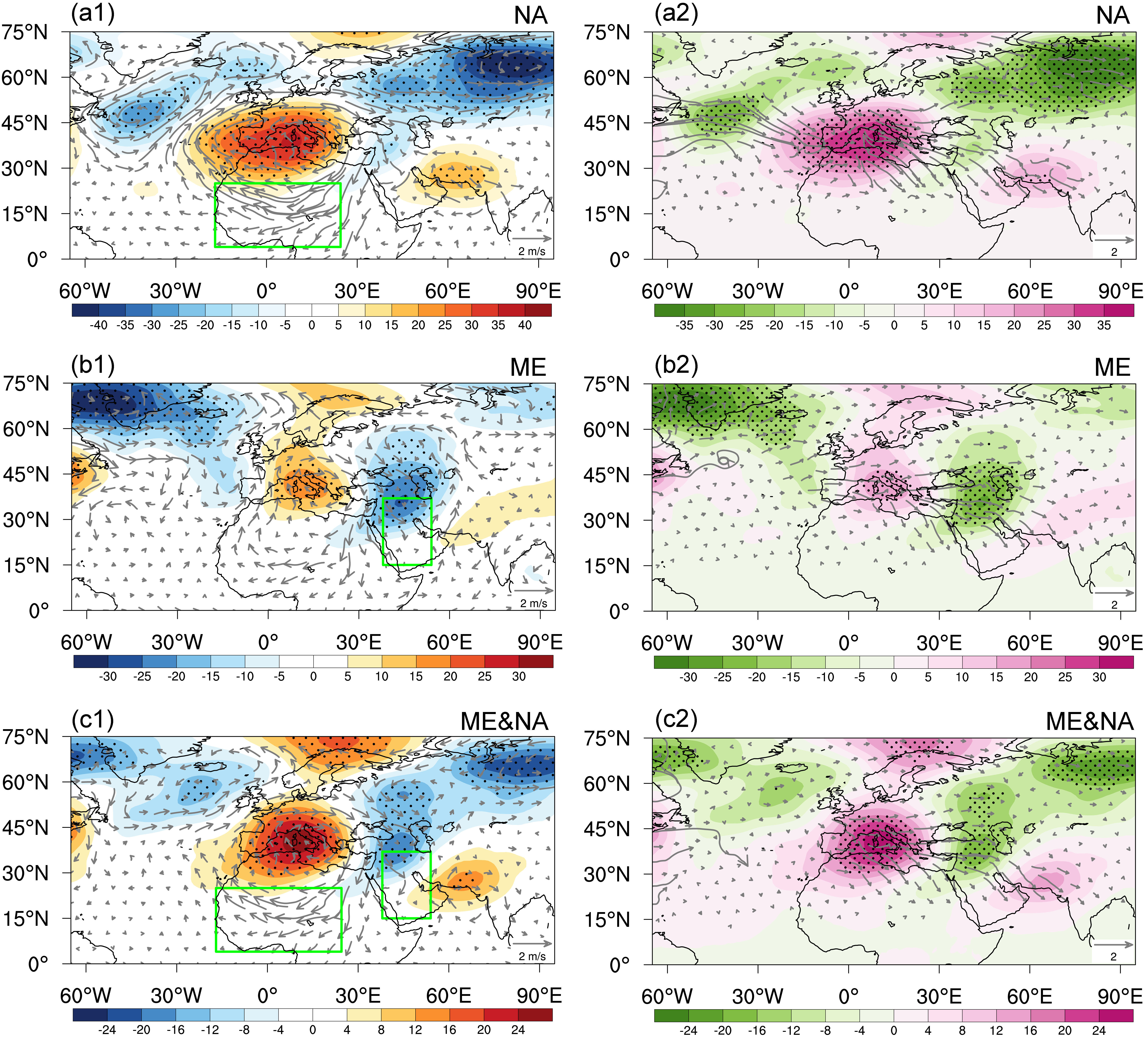 2.a1)北非极端沙尘事件期间大气环流和位势高度相较于春季均值的差异及(a2)相应的罗斯贝波通量。(b1)中东极端沙尘事件期间大气环流和位势高度相较于春季均值的差异及(b2)相应的罗斯贝波通量。(c1)北非和中东极端沙尘事件合并后大气环流和位势高度相较于春季均值的差异及(c2)相应的罗斯贝波通量。
