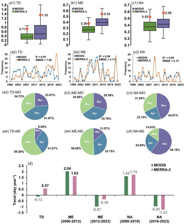 1.a1-c12000-2023年塔克拉玛干沙漠、中东和北非地区春季逐日沙尘光学厚度箱型图及极端沙尘事件阈值。(a2-c2MODISMERRA-2的极端沙尘事件频次年际变化时间序列。(a3-c4MODISMERRA-2中春季极端沙尘事件在345月的占比。(dMODISMERRA-2给出的2000-2023年春季极端沙尘事件频次趋势。
