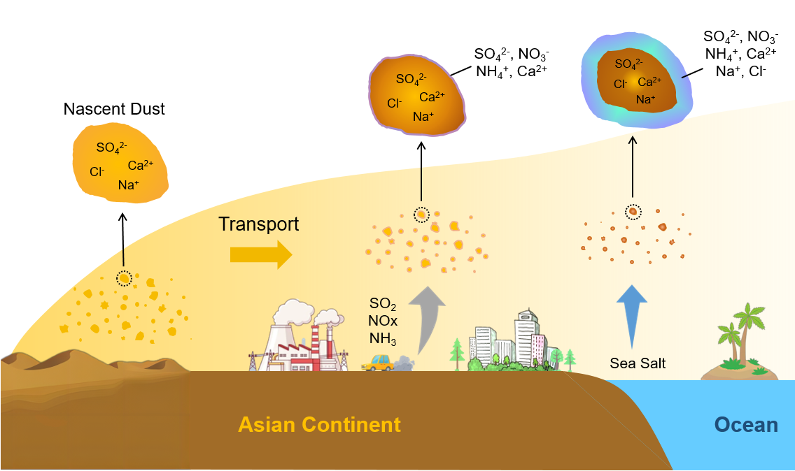 图3.东亚地区沙尘气溶胶在长距离传输过程中WSIs含量增加的示意图。
