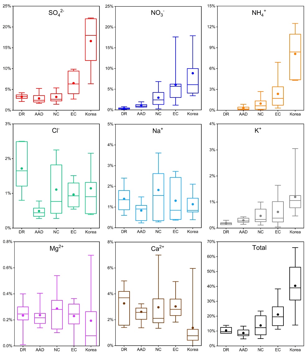 图2.不同区域沙尘气团中大气细粒子中的水溶性离子(WSIs)质量占比。DR、AAD、NC和EC分别代表沙漠地区、沙漠毗邻地区、华北地区和华东地区。最后一幅图(右下角)展示了各地区沙尘气团中WSIs的总质量占比。
