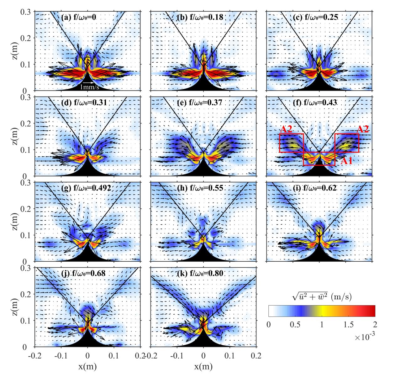 2.不同f/ω0条件下y=0x-z断面平均流的速度场,箭头为速度矢量,背景色为速度大小,黑线表征内潮射线的斜率。