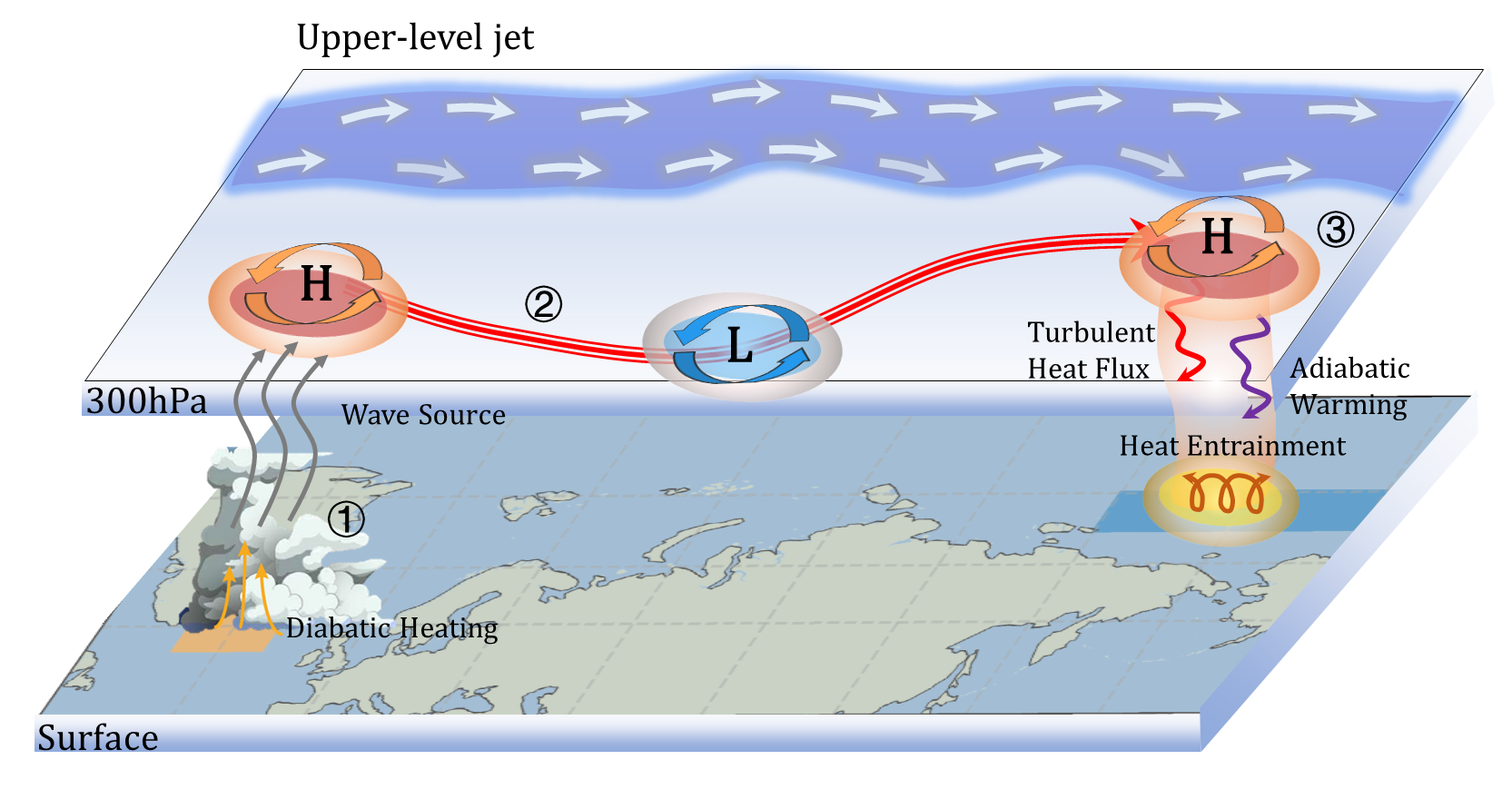 2. 北大西洋夏季海洋热浪推迟楚科奇海和东西伯利亚海FO的关键物理过程示意图。每一个数字代表一个具体过程:①格陵兰东南海域近地表暖空气驱动暖湿空气上升至300 hPa;②增强行星波向下游传播;③楚科奇海和东西伯利亚海FO受反气旋式环流控制,下沉气流导致绝热增温。