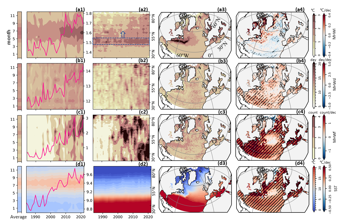 1. 北大西洋热浪强度(MHWi,持续天数(MHWd,发生频率(MHWf,海表面温度的季节-年际变化(a1-d1,随纬度-年际变化(a2-d2,气候态分布(a3-d3,趋势(a4-d4)。