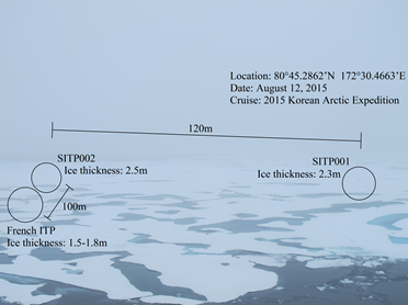 开云电竞网址两名科研人员于2015年8月11-12日在长期冰站布放了两套浅水ITP浮标,具体布放位置如图2所示,两套浮标布放位置处的海冰厚度分别为2.3米和2.5米。相距150米左右。截止到2016年3月,两套浮标都正常工作,并将冰下上层海洋的水文数据实时传输回国内。