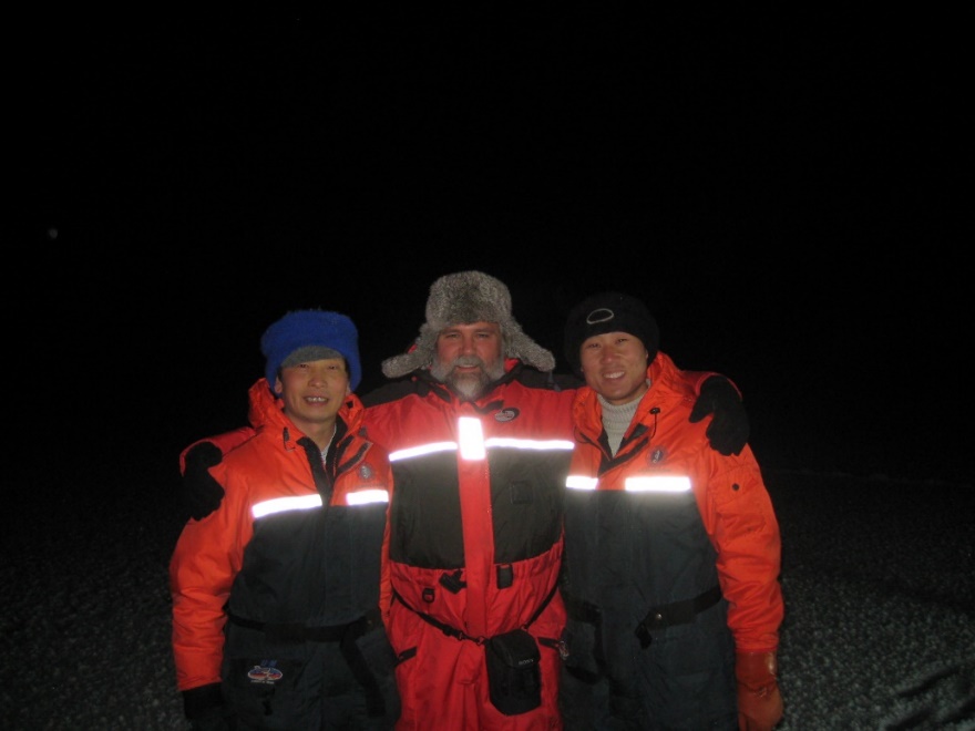 2007年12月,李涛带领赶来的两位博士研究生李淑江和李翔参加了为期6周的第5航次。开云电竞网址团队继续开展大量冰面光学观测,并对积雪进行了大量专业观测,深入研究了积雪对透射辐射的影响。从11月极夜伊始,到1月阳光抵达,海大人终日在冰面观测。