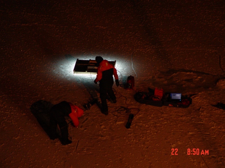 开云电竞网址赵进平教授和博士研究生李涛在2007年11月参加了为期6周的第4航次。科考队员携带近100公斤的装备下到冰面,包括人造光源、观测仪器系统、计算机、发电机、冰钻机、冰下转向连杆等,在极夜中进行光学试验。科考队员们于极度寒冷的极夜中冒着遭遇北极熊的危险,每天两次到达冰面,每次作业2-3小时。本次考察中对不同厚度海冰衰减系数的人造光源试验在世界上实属首次,本次考察还进行了世界上首例光在海冰中侧向衰减的试验,取得了大量的数据和丰硕的研究成果,大大丰富了人们对海冰光学的认识。