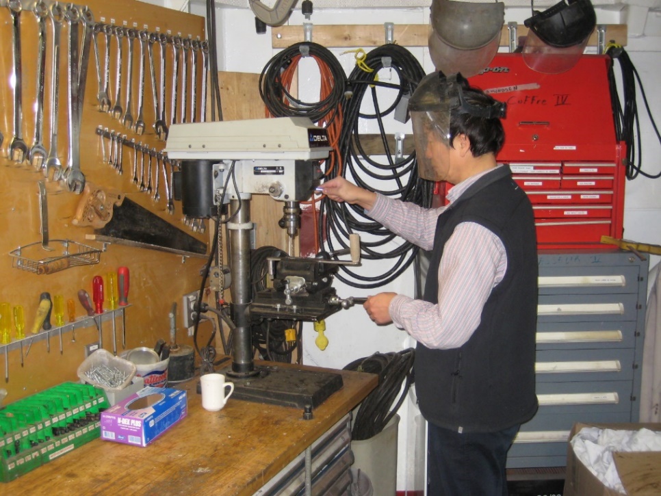 上图:正在工作间对设备进行改造的赵进平教授。在观测过程中因为之前缺少极夜期间海冰和海洋作业的经验,导致部分设备零件在极夜酷寒条件下出现极易出现故障,好在船上有专业的加工设备间,可以因地制宜根据需要及时调整设备结构,保障观测任务顺利进行。