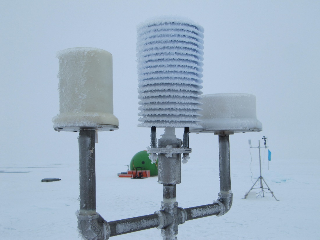 上图:经历一次雨雪天气过程后的冰基海洋气象浮标。因为夏季北极低温高湿的特殊天气条件,极易发生传感器被冰凌或者积雪覆盖住的情况,如果不及时清理随着结冰程度进一步加重就会干扰到正常的观测。长期冰站每天可以由人去打理,对无人的冰站,长期观测必须考虑这种冻雨冻雪情况对数据可能造成的影响,对于后期数据分析更是要谨慎对待观测数据,谨记真实环境和观测条件二者之间可能存在自然的误差。