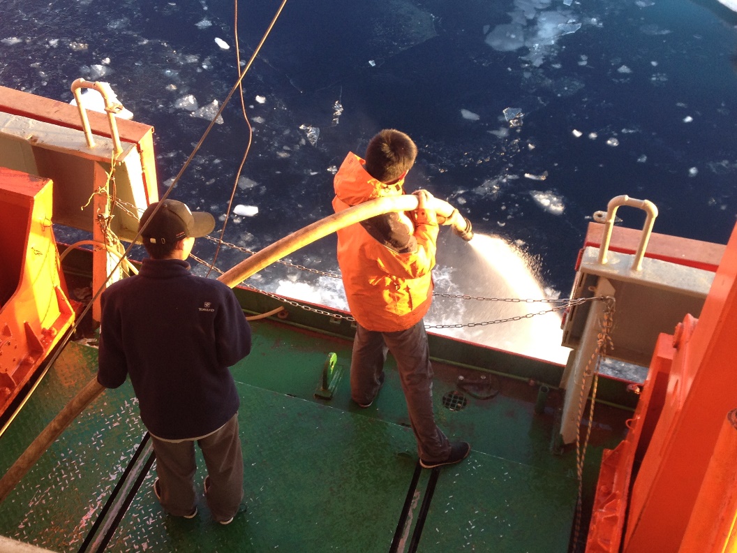 上图:使用消防龙头对船体作业面的海冰冰渣进行驱赶,保障水下仪器安全。在冰区观测过程中,因为风向或者流向的变化,有可能会突发海冰冰碴向作业面集聚的情况,此时海水中细微的冰碴极易被仪器水泵泵入传感器而导致仪器探头受损。此时需要记住消防龙头的高压水枪,将作业面周围的冰碴驱离,然后仪器迅速安全地抬升出水。