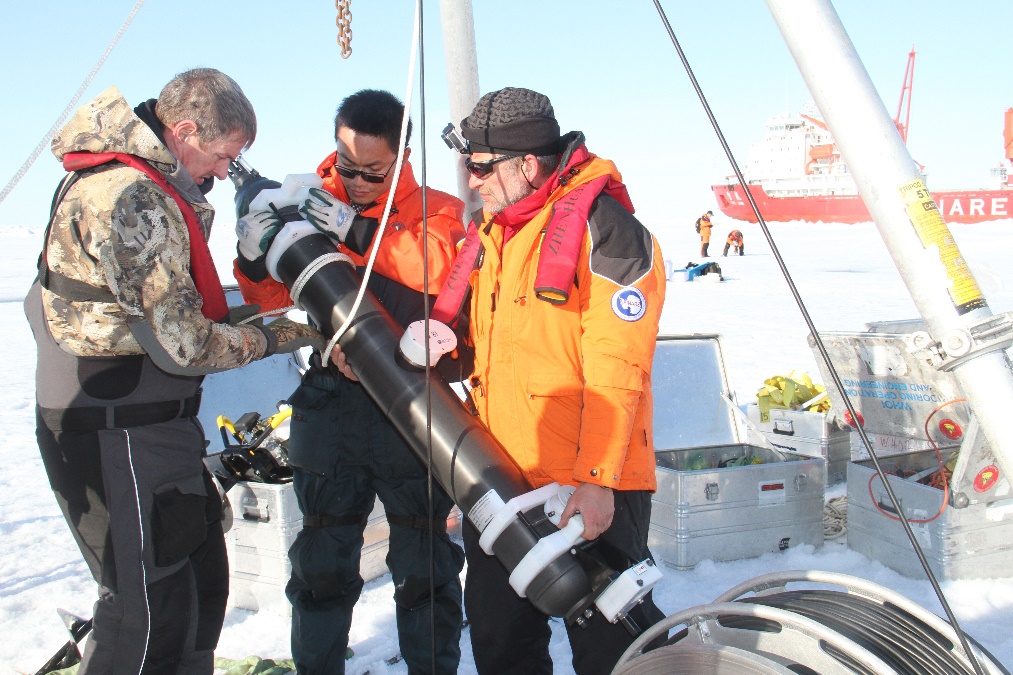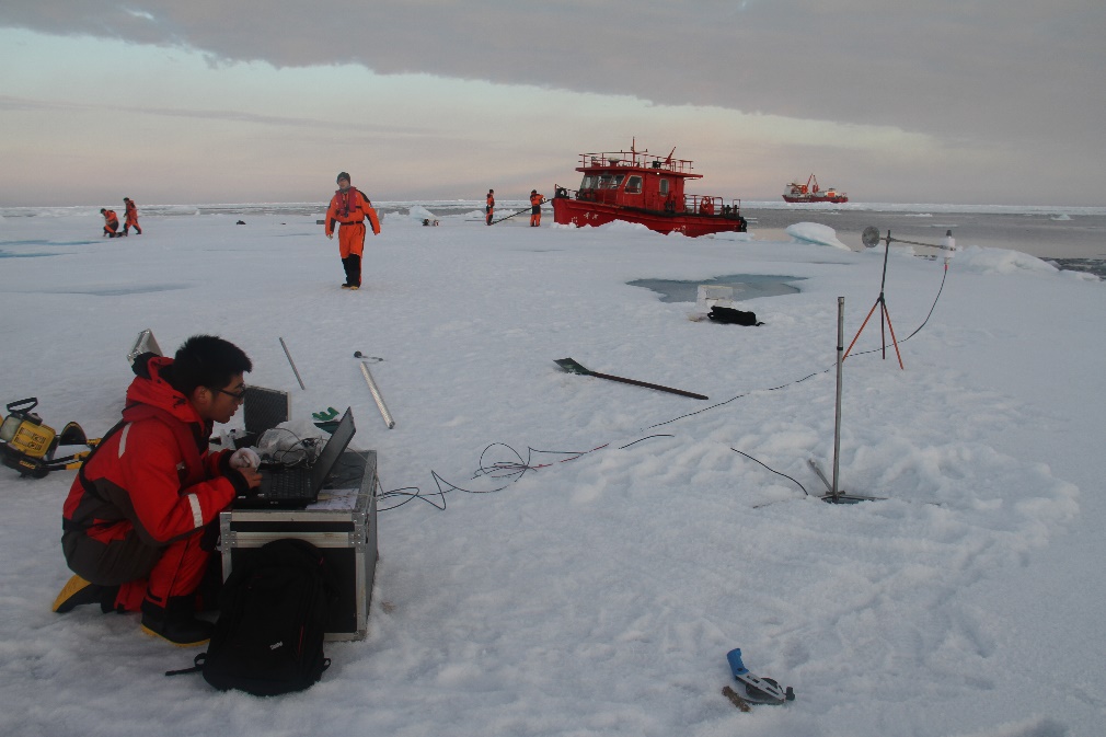 本次考察在物理海洋研究领域旨在了解太平洋扇区(传统北冰洋考察海域)内部海洋水文气象基本环境信息,为全球气候系统研究、航道利用、生态资源保护等提供第一手研究资料,我实验室在本次考察中承担和参与的工作主要包括重点海域水文断面观测、海洋光学观测、湍流观测和海冰冰站调查。我实验室成员由李涛带队,博士生钟文理、王晓宇和牟龙江共4人全程参加了本次考察。此外来自我校工程学院的綦声波教授也参加了本次考察。